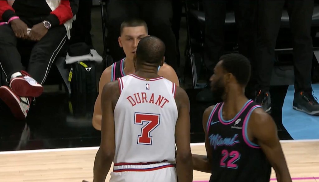 That contest featured an early flashpoint when Durant and Miami guard Tyler Herro exchanged words near the Heat bench in the opening quarter, resulting in technical fouls for both players.